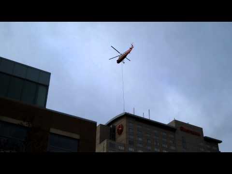 Helicopter Lift, Environmental Mechanical Contractors - Environmental Mechanical - Environmental Mechanical Contractors coordinates a helicopter lift to set a 100-ton condenser unit and stacked DX coils on the roof of the 20-story Overland ...